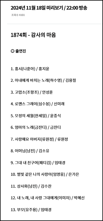 오늘 1874회의 주제는 감사의 마음이네요. 유명한 분들이 나와서 멋진 무대를 장식할 예정이네요. 멋진 감상을 하시기 바랍니다.