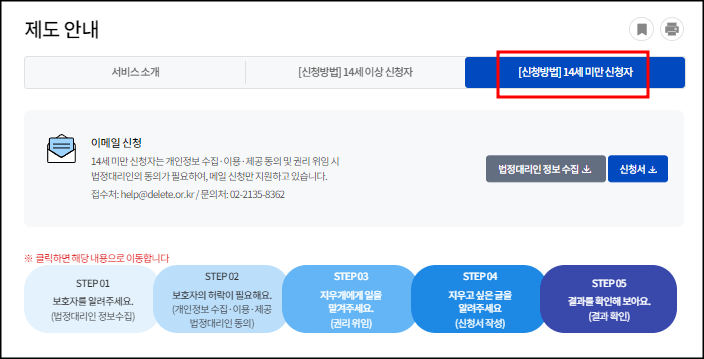 지우개 서비스는 14세 이상 신청자, 14세 미만 신청자 구별하여 신청할 수 있습니다. 14세 미만 신청자는 법정대리인의 동의가 필요합니다.