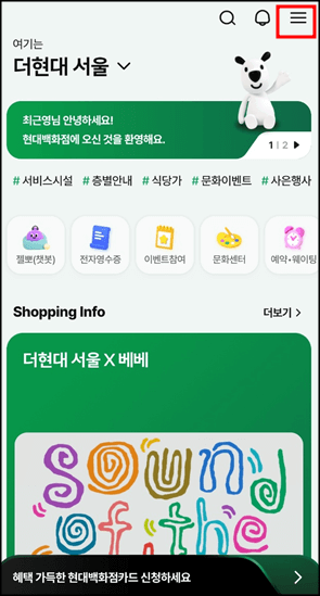 오른쪽 위 줄 3개 三 버튼을 눌러줍니다. 그다음 현대백화점 > 주차정산을 눌러줍니다.