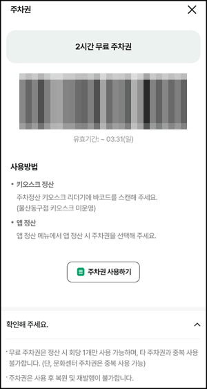 키오스크정산을 눌러주시면 2시간 무료주차권을 사용하실 수 있습니다.