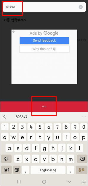 휴대폰에서 센드애니웨어 프로그램을 실행합니다. 아래 메뉴에서 '받기'를 선택하신 후 '키를 입력하세요'부분에 PC컴퓨터에서 받은 6자리 숫자를 입력해줍니다. 숫자 입력 후 '받기'버튼을 눌러주세요. 그러면 광고가 잠시 나온 후 전송내역에서 받은 파일을 보실 수 있습니다.