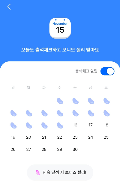 하루도 빼먹지 않고 한달동안 미션 달성 성공하면 일반 파랑젤리가 아니라 스페셜 젤리를 받습니다.