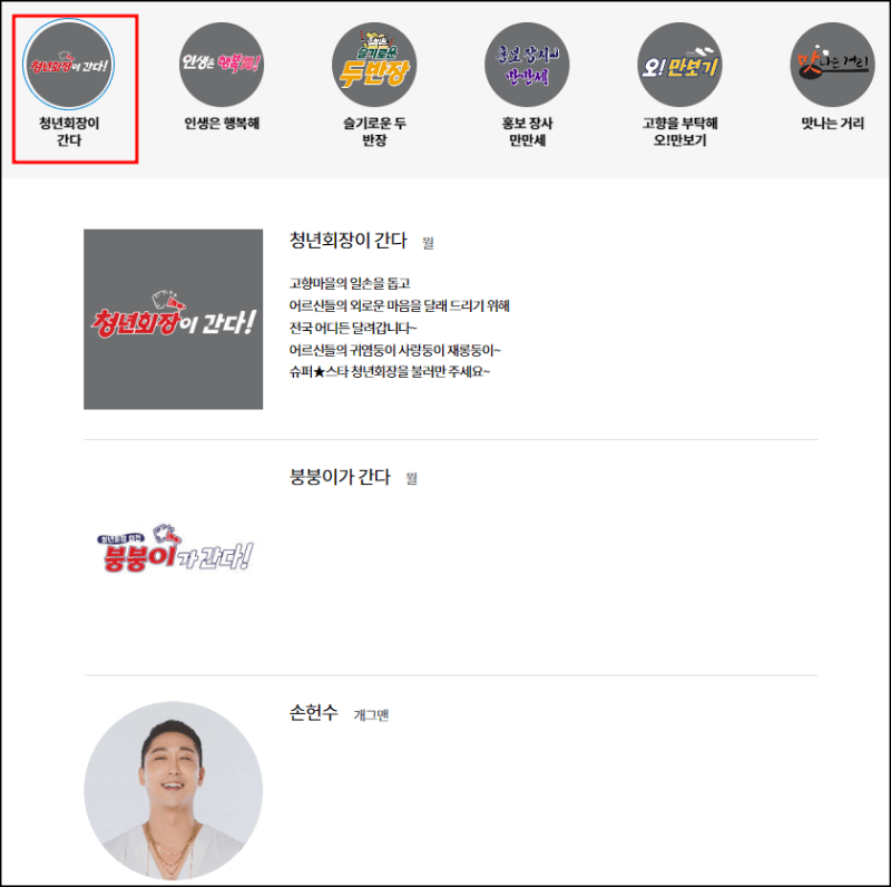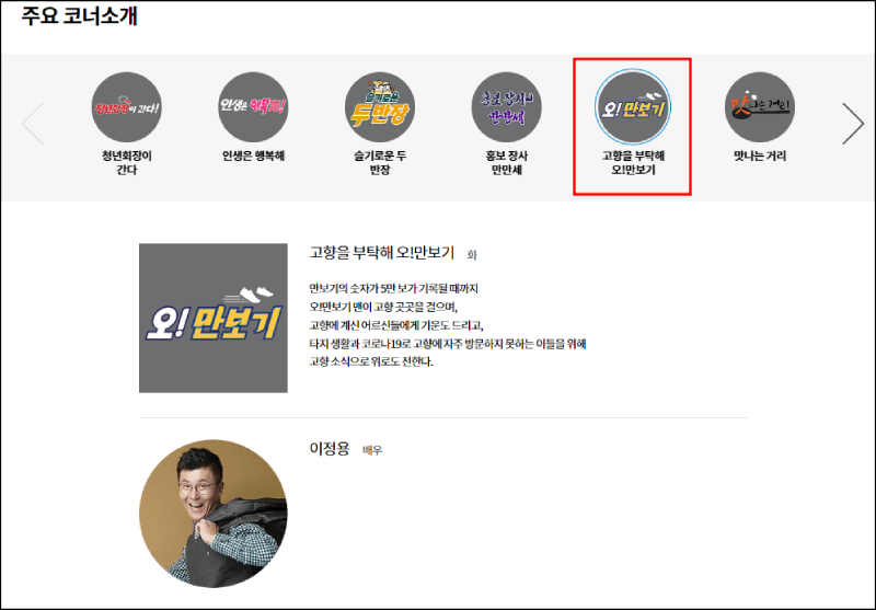 6시 내 고향에서 큰 사랑을 받고 있는 주요 프로그램을 소개하는 페이지입니다. 주요코너소개 페이지에서는 많은 사랑을 받고 있는 청년회장이 간다, 인생은 행복해, 오만보기등 주요 코너를 담당하는 분들이 누구인지 확인해 볼 수 있습니다.주요 코너소개를 책임지고 이끌어가는 분들을 지금 바로 확인해 보세요.
